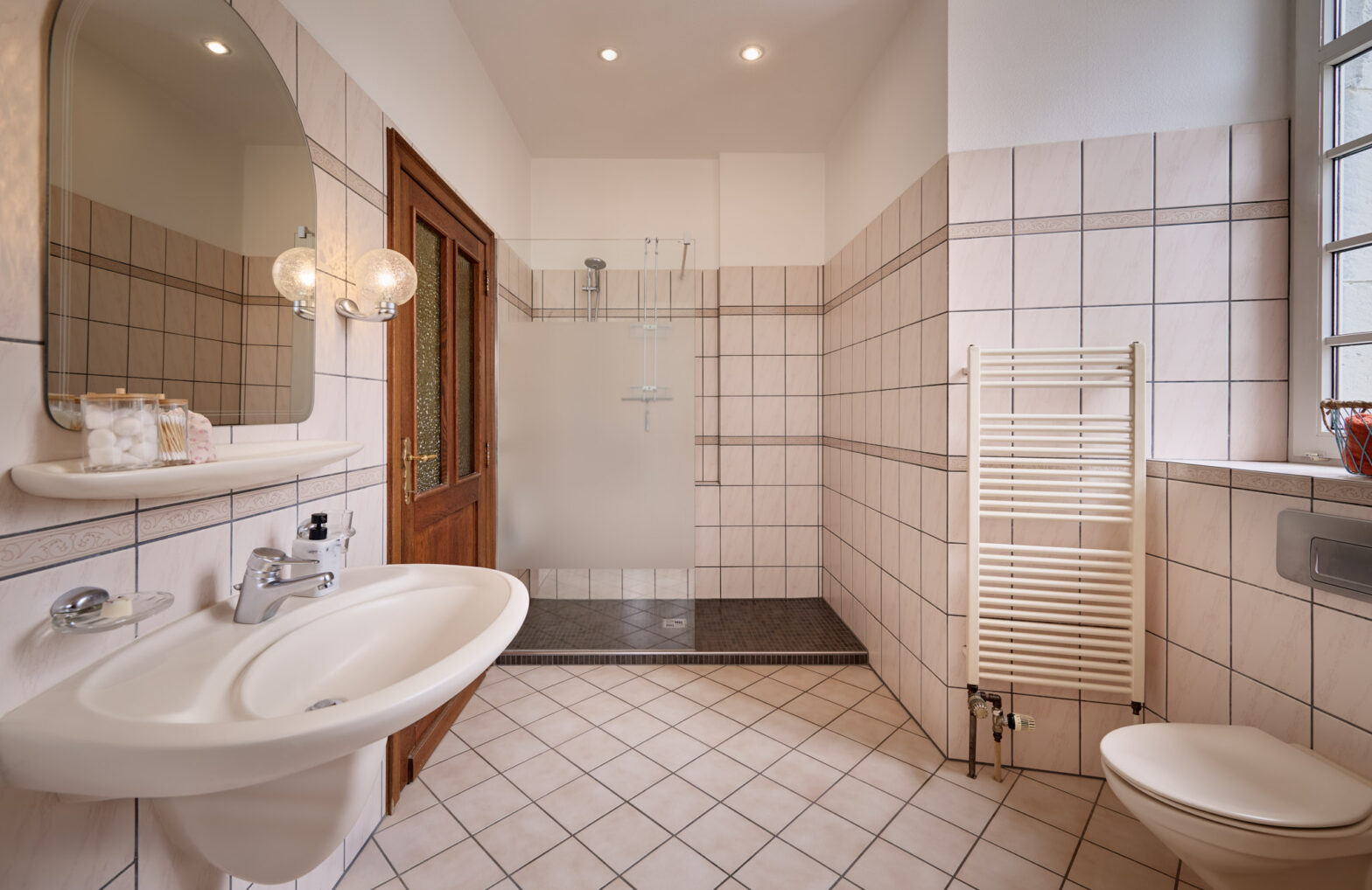 - Badezimmer mit Dusche, WC, Föhn und Handtücher